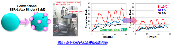 對電池膨脹的影響:對粘結(jié)劑粒子表面單體成分控制,并進(jìn)行表面改性,從而達(dá)到對活性物與金屬有極好的粘接力,抗電解質(zhì)化學(xué)穩(wěn)定性,漿料中膠體的穩(wěn)定性。加上對粘結(jié)劑本身的延展性(Strain)和強(qiáng)度(Stress)的控制,可達(dá)到抑制電極膨脹目的。