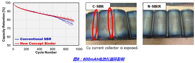 對循環(huán)性能的影響:粘結(jié)劑粒子的耐電解液特性提高,強(qiáng)度及彈性隨時(shí)間變化減少,粘結(jié)力才能夠得到長期保障。特別是在長期循環(huán)的情況下,越發(fā)能夠體現(xiàn)對粘結(jié)劑彈性及耐久性的考驗(yàn)。