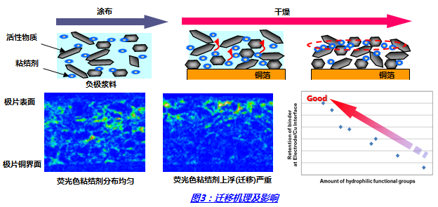 對遷移抑制的影響:粘結(jié)劑是有機(jī)化學(xué)品,懸浮于水中呈液態(tài)乳液狀。添加在漿料中并涂布在極片上,為提升生產(chǎn)效率,一般會(huì)對烘干溫度進(jìn)行提升(傳送速度快)來滿足生產(chǎn),溫度高時(shí)水分的蒸發(fā)速度更快,因此懸浮的粘結(jié)劑會(huì)快速的遷移至極片表面,造成Cu界面粘結(jié)劑缺失,特別是在輥壓時(shí)引起粘輥或脫粉,掉料等現(xiàn)象。