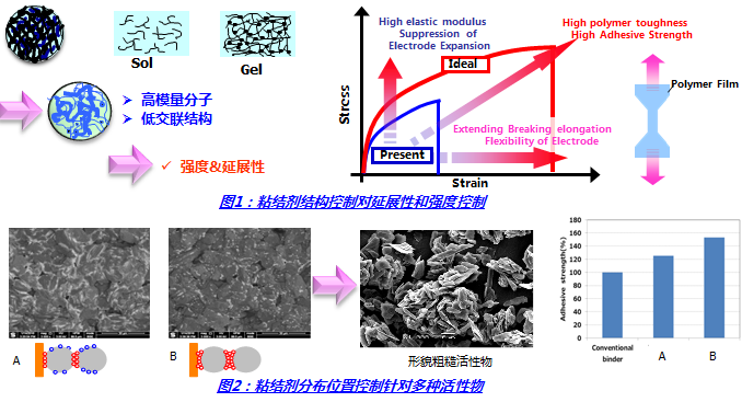對粘結(jié)強(qiáng)度的影響:通過對高分子聚合物構(gòu)造和分子量的的控制,可以對粘結(jié)劑在鋰電池內(nèi)部的延展性(Strain)和強(qiáng)度(Stress)進(jìn)行控制。通過粘結(jié)劑粒子表面官能團(tuán)改性,能夠影響到粘結(jié)劑在活性物中的分布位置(粘結(jié)劑有效聚集與活性物質(zhì)接觸部位)。面對不同活性物質(zhì)可以通過分布影響并提高粘結(jié)強(qiáng)度。