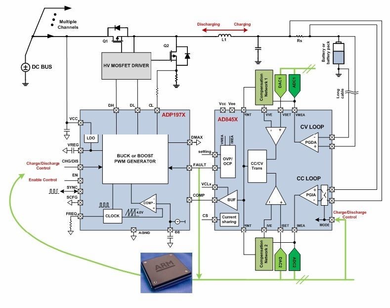 上圖包含兩種功能:一是對電池充電,二是對電池放電,這由AD8450/1和ADP1972的模式信號決定。每個功能有兩種模式:恒流(CC)模式和恒壓(CV)模式。兩個DAC通道控制CC和CV設定點。CC設定點決定充電和放電兩個功能的CC模式下環路中有多少電流。CV設定點決定環路從CC進入CV時的電池電位,同樣適用于充電和放電兩個功能。