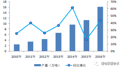 2016年,我國鋰電池正極材料產量為16.16萬噸,同比增長43.14%;2010年至2016年,年復合增長率高達36.48%。行業產值則從2010年的57億元增長到2016年的208億元,年復合增長率高達24.08%。