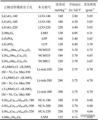 表1計算所用正極活性物質及其比容量、電壓