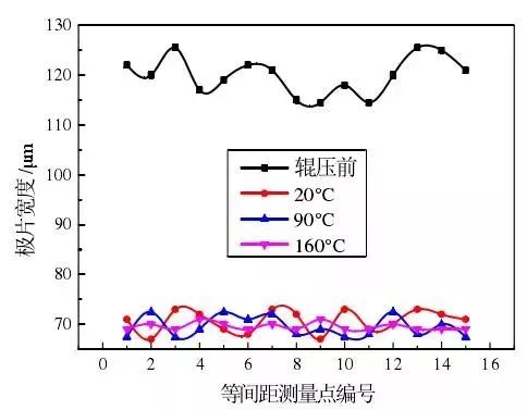 圖1為涂敷厚度為100μm的極片在不同軋制溫度下的厚度曲線,如圖所示,隨著軋制溫度由20°C增加為90°C再增加為160°C,極片厚度偏差由±1.9μm降低為±1.3μm再降低為±0.8μm,極片厚度一致性逐漸提高,這是因為隨著軋制溫度的增加,極片涂層變形抗力減小,可塑性變好,使得極片表面厚度更加均勻。